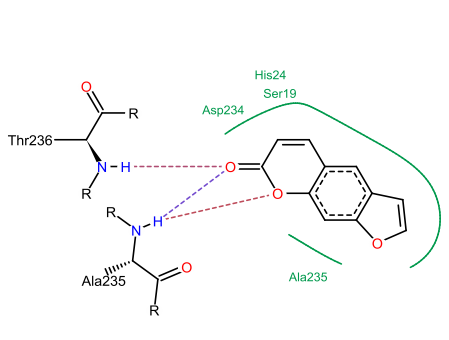 | Psoralen | O10-GLU219A O22-GLU219A H20-THR 165A H20-ASP 148A |