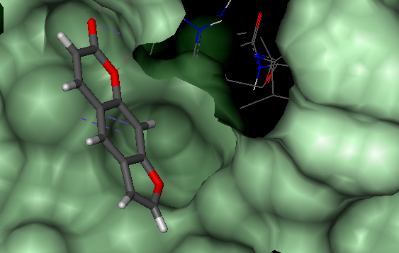 Fig. 1: Docked structure of InhA protein with psoralen (Left) and binding to target active site (right)