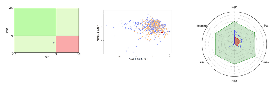 (a). Compounds located in the red square are likely to cause toxicity and experimental promiscuity (b). The chemical property space was obtained by applying a Principal Component Analysis (PCA) of the 15 principal physico-chemical descriptors of user's compound (red), compared to two oral sub-libraries extracted from Drugs and DrugBank (c). Compound values (blue line) should fall within RO5 and Veber rules area (light green).