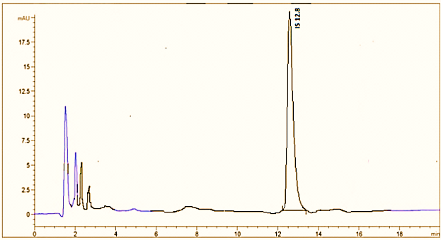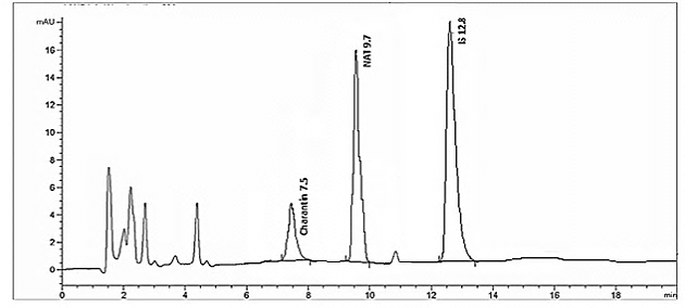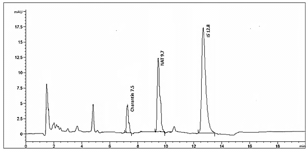 The chromatographic separation was performed using an HPLC binary gradient system equipped with an autosampler system and a UV detector UV-3000-M with a Grace C18 column (250 mm x 4.6ID, Particle size: 5 µm). The mobile phase system was optimized to give a good resolution of Charantin, NAT, and Repaglinide (I. S.) from other endogenous substances in the plasma sample. The mobile phase consisted of the mixture of solvent A (Methanol), solvent B (10 mmol Phosphate Buffer) in the ratio of 80:20 (v/v) for 18 min at a flow rate of 1 ml/min. The NAT, Charantin, and I. S. were detected at 7.5, 9.7, and 12.8 min, respectively (fig. 2). The concentration of Charantin was determined using the peak area ratio of pure Charantin to I. S. The concentration of Charantin in MCE was determined using the peak area ratio of Charantin in MCE and I. S. Similarly, the concentration of NAT was determined using the peak area ratio of NAT and I. S. Further validation of the method was done according to the US Food and Drug Administration (USFDA) guidelines for selectivity, matrix effects, recovery, and stability [19].