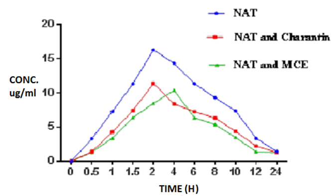As per hypothesis, pharmacokinetic interactions were found by a significant decrease in Cmax of NAT from 16.28 µg/ml to 11.37 µg/ml and 10.37 µg/ml with NAT with charantin and NAT with MCE groups, respectively. Decrease in AUC of NAT was observed from 84.53 h/µg/ml to 53.63 h/µg/ml and 47.17 h/µg/ml by co-administration with Charantin and MCE, respectively. Fast elimination of NAT was observed with increased t1/2 from 9.18 to 11.72 hr, Vd from 0.11 to 0.37 L and Cl from 0.08 to 0.22 L/h when co-administered with Charantin. Whereas t1/2 of NAT increased from 9.18 up to 11.80 h, Vd from 0.11 to 5.51 L and Cl from 0.08 to 0.32 L/h when co-administered with MCE. Co-administration of NAT with Charantin and MCE decreased the systemic exposure level of NAT in vivo, with decreasing Cmax and AUC, but increased t1/2 is significantly more with NAT+MCE treated group compared to NAT+Charantin treated group. These results indicated slow metabolism for NAT and a better volume of distribution has been achieved in the combination group.