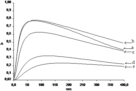 Fig. 1: average of change in turbidity without and with acetylsalicylic acid (inhibitor) (a): Control, (b): ASA at 0.83 mM, (c): ASA at 1.66 mM, (d): ASA at 3.34 mM, (e): ASA at 5 mM