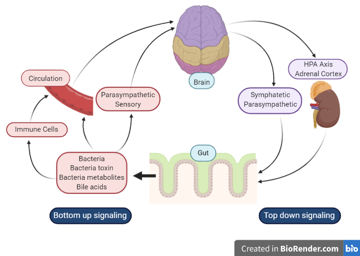 The extent of the interaction mechanism between the gut microbiota and non-gastrointestinal organs is still being studied in various studies. However, evidence suggests that there is two-way communication between the gut, microbiota, and brain. This two-way communication is known as the microbiota-gut-brain axis. Signaling between the brain and gut occurs via neuronal and non-neuronal mechanisms (fig. 1 and 2). For signaling from the brain to the intestine, the intestinal wall receives direct communication through parasympathetic and sympathetic nerve fibers or indirectly follows stimulation of the enteric nervous system, namely the system of nervous connections located in the submucosa and the myenteric plexus of the intestine (fig. 2). This neuronal mechanism affects intestinal motility, intestinal permeability, microbiota composition, and activation of immune cells. Not only direct neuronal mechanisms, but the hypothalamic-pituitary-adrenal axis is also very important as a communication pathway in response to stress (fig. 1).