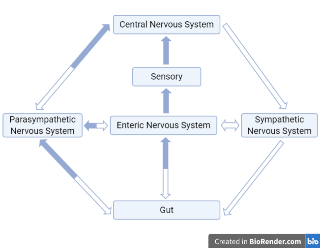 Fig. 2: The neuronal mechanism of communication between the brain and the gut. The blue arrows show that the afferent nerve signaling from the gut to the brain, white arrows show efferent nerve signaling from the brain to the gut [9]