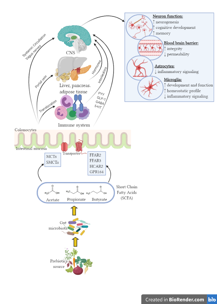 SCFAs may directly influence the brain by strengthening BBB integrity, modulating neurotransmission, influencing levels of neurotrophic factors and increasing memory consolidation. However, more research is needed to understand the exact mechanisms involved in these neuroactive effects.