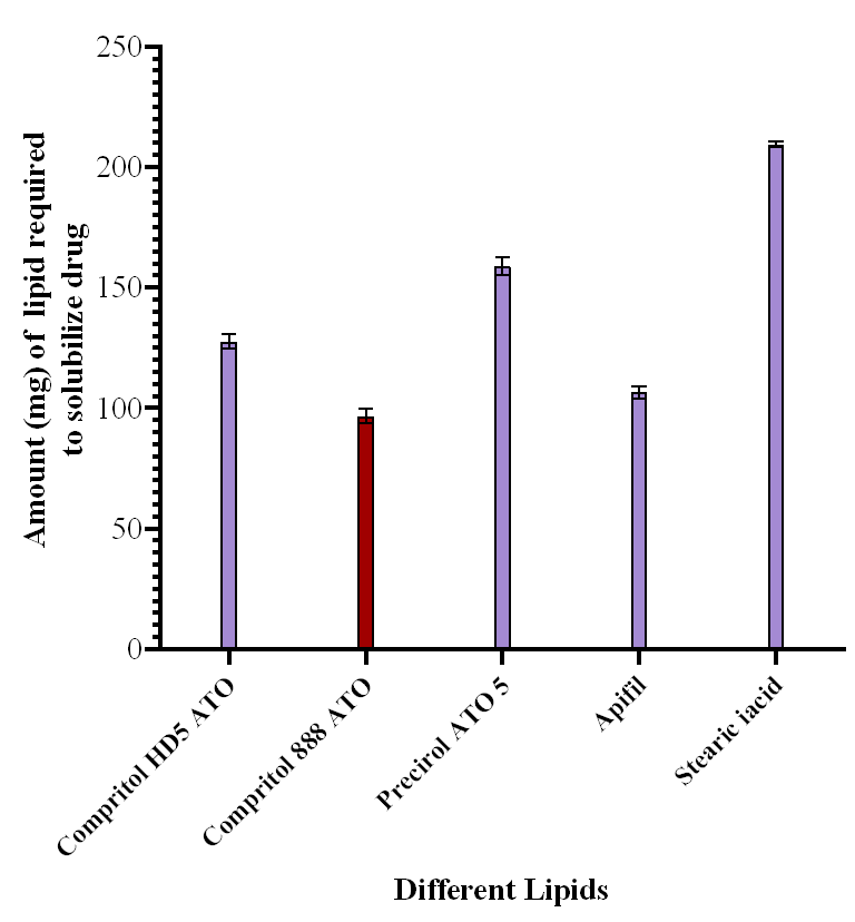 A limiting factor in the formulation of SLNs is the amount of solid lipid needed to solubilize the drug. In Solid lipid nanosuspension formulation, the amount of lipid required to solubilize the drug is a crucial factor as it has a significant impact on the % entrapment efficiency. As per the details shown in fig. 1, to conduct the solubility analysis, five distinct solid lipids were taken. DOX solubility in Compritol 888 ATO required a lower quantity, suggesting higher drug solubility. As it has been successfully used in various pharmaceutical dosage types, Compritol 888 ATO has attracted particular interest. The applicability of Compritol 888 ATO in the preparation of aqueous colloidal dispersions such as solid lipid microparticles (SLMs), solid lipid nanoparticles (SLNs) and nanostructured lipid carriers (NLCs) to capture lipophilic drugs has been highlighted in various research studies [14-20].
