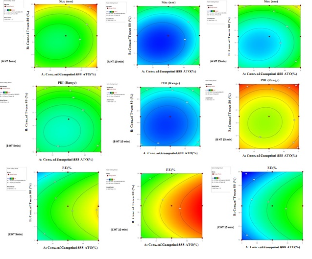 33 experimental design was used for the optimization and evaluation of the relationship between the independent variables [critical process parameters (CPP)] viz., X1= lipid concentration, X2= surfactant concentration, and X3= High-Speed Homogenizer (HSH) time and dependent variables (responses) [Critical Quality Attribute (CQA)] such as Y1= Particle size, Y2= Polydispersibility index (PDI) and Y3= % Entrapment efficiency (EE) (table 1). Here, Compritol 888 ATO, Tween 80, and poloxamer 407 were selected as lipid, surfactant, and stabilizers, respectively. Drug concentration (2 mg/ml), HSH speed (10000 rpm) and Poloxamer-407 concentration (1% iw/w), sonication amplitude (20%) were set as fix levels.