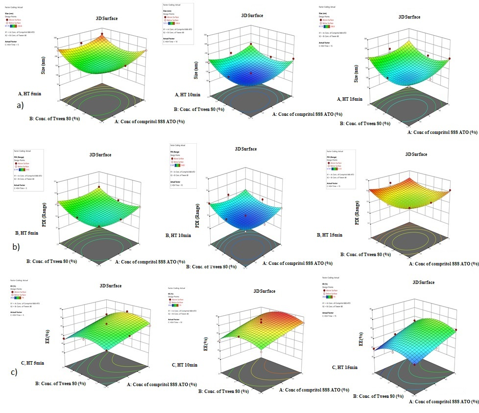 33 factorial was developed to analyze the main effect, the interaction effect, and the quadratic effect of three independent variables (CPP) on the three responses (CQA). In this case, 30 experiments run were performed, and the results were shown in table 2.
