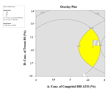 To create a design space to ensure the quality of the product you want, the impact of each independent CPP on CQA was analyzed. 33 factorial design is used in the design space proposal to examine process parameters, the answer to the quality attributes of DOX SLNs is used. The optimization is carried out using an overlay plot (graphical) and desirability (numerical) parameters based on finding the particle size, PDI, and higher EE percentage.