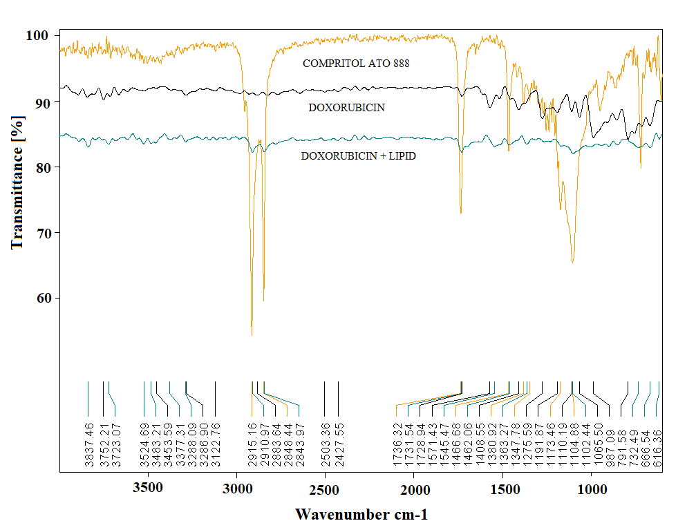 FTIR spectroscopy of Doxorubicin hydrochloride, pure lipid excipients, and physical mixture (DOX+lipid) was performed using the Fourier transform-infrared spectrophotometer (Alpha-model Bruker ATR FTIR spectrophotometer). Spectra were scanned at a resolution of 4 cm-1 over a wavelength region of 4000 to 400 cm-1. The process consisted of dispersing KBr samples and compressing them into discs by applying a hydraulic press pressure of 5 tons for 5 min (KBr pellet method). In the light direction, the pellet was positioned and the spectrum was collected.