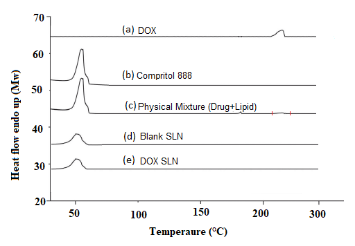 DSC measurement of Pure Drug Doxorubicin(DOX), Pure Lipid excipients and Physical mixture (DOX+Lipid), blank (placebo) SLNs, and DOX loaded SLNs formulation was performed with an instrument (Perkin-Elmer Diamond DSC) for measurement of the thermotropic transition of lipids. Empty aluminum pans were used as reference and samples were carefully placed in another aluminum pan. The measurement was done in an inert atmosphere within the temperature range of 30 °C to 200 °C, at 5 °C per min.