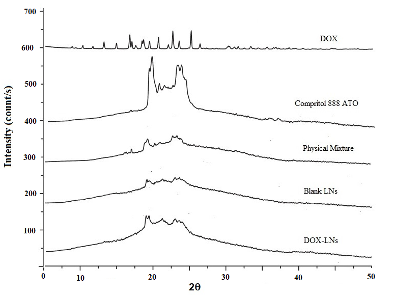 At scattered angles, DOX's XRD patterns displayed sharp peaks, ranging from 15° to 25°, suggesting their crystalline existence. Light diffraction peaks of DOX were observed in the physical mixture at around 16 °, showing incomplete dissolution and the presence of a crystalline state of both drugs in bulk lipid. The blank SLN and DOX-SLNs XRD patterns were wider and much weaker than the bulk lipid. There were no characteristic peaks in DOX-SLNs for DOX, however, indicating the amorphous state of DOX. The XRD result of these DOX-SLNs was following that of the DSC.