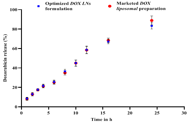 Fig. 10: Comparison of % in vitro drug release profile of optimized DOX-LNs with marketed DOX liposomal preparation