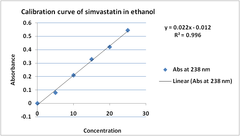 The stock solution was prepared by taking accurately weighed 100 mg of simvastatin in a 100 ml volumetric flask and dissolving it in ethanol and volume made up to the 100 ml mark. The concentration of the solution was 1000 µg/ml. From the stock solution, 1 ml was pipetted in a 10 ml volumetric flask and the volume was made up to mark with distilled water to obtain the concentration of 100 µg/ml. This was a working standard solution. from this solution, 0.5, 1, 1.5, 2, 2.5 and 3 ml were pipetted in separate 10 ml volumetric flasks and diluted up to mark with distilled water to get final concentrations of 5,10,15,20,25,30 µg/ml. The Samples were measured spectrophotometrically at λmax of a drug against ethanol as a blank. Absorbance values were plotted against concentrations of the drug to obtain a calibration curve [9].