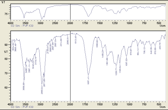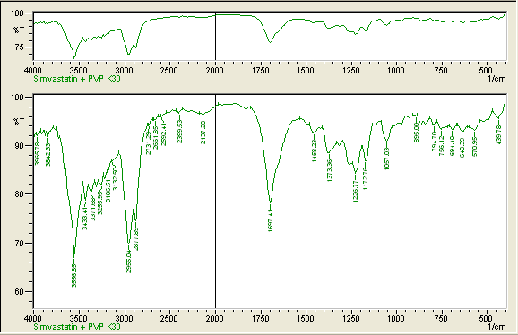 FT-IR spectrum of simvastatin showed peaks of characteristic functional groups at wavenumbers 3549.14 cm-1 (free O–H stretching vibrations), 1705 cm-1 (stretching vibration of ester and lactone carbonyl functional groups), and 2877 cm-1, 2955 cm-1 (C–H stretching vibrations) as shown in fig 3. FT-IR spectrum of PVP K30 is shown in fig. 4. The major peaks of simvastatin were retained in the physical mixture and solid dispersions as shown in fig. 5 and fig. 6, respectively. Peaks of-OH Stretch (3566.85 cm-1), carbonyl group (1697.47) are observed to be shifted by some difference. The possible reason for shifting is intermolecular hydrogen bonding. But, no major difference was observed which indicates the compatibility of drug and PVP K30 in solid dispersion. In Solid dispersions, the possibility of hydrogen bonding between simvastatin and PVP is due to PVP. As PVP has two groups =N, =O that can potentially form a hydrogen bond with the drug [15].
