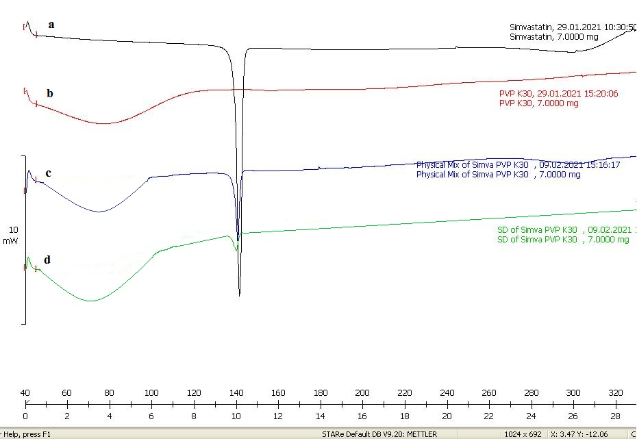 The DSC Thermogram of simvastatin showed a sharp endothermic peak at 140 °C temperature as shown in fig. 7. The sharp, intense peak indicates the pure crystalline nature of the drug. PVP K30 showed a wide endotherm in the temperature range of 56-95 °C which can be attributed to loss of water due to hygroscopic nature [20]. In the physical mixture, both endotherms were observed indicating compatibility of drug and PVP K30. Lastly, in SD Thermogram, a less sharp peak of the drug was seen or can be said to be disappeared as compared to the thermogram of pure drug, but a wide endotherm at the range of 50-95 °C indicates entrapping of simvastatin in the carrier and confirms the amorphous nature of solid dispersion. A decrease in the intensity of the sharp peak of simvastatin can be attributed to increased dissolution or entrapment of simvastatin in the PVP K30 [21].