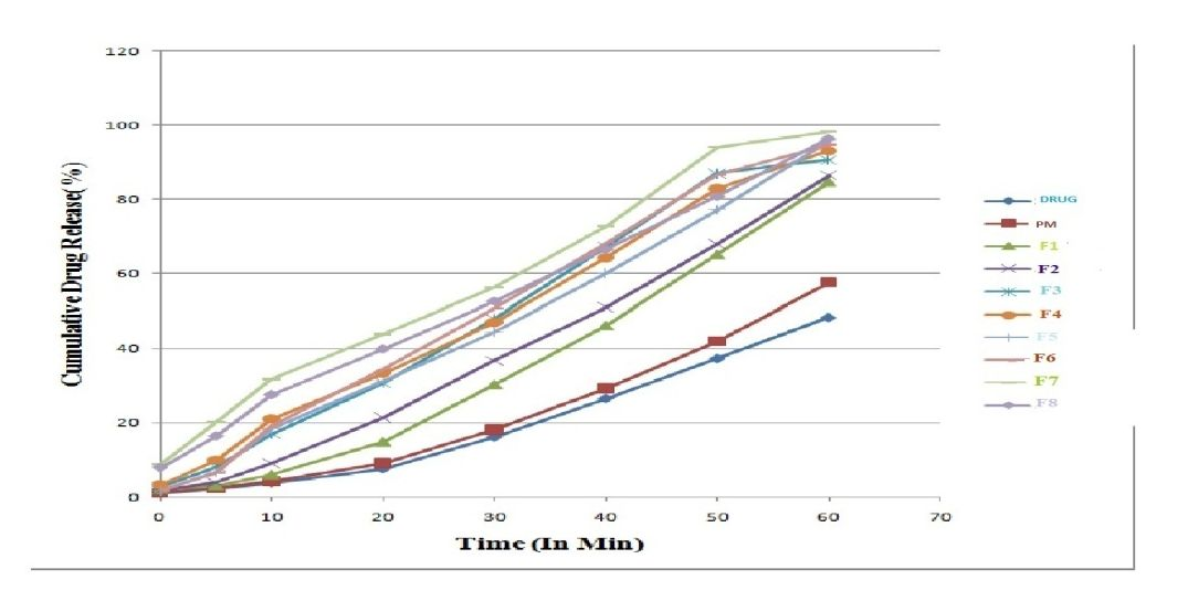 Fig. 8: In vitro dissolution profile of a pure drug, physical mixture, and solid dispersions (F1 to F8)