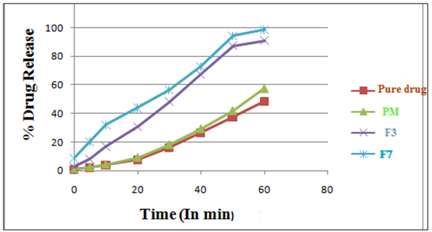 Fig. 9: In vitro dissolution profile of a pure drug, physical mixture, F3 and F7 formulation