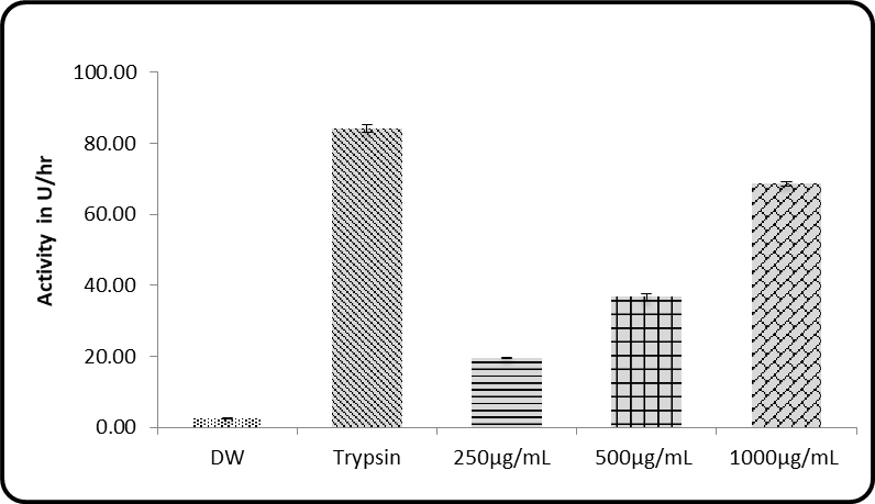 Fig. 2: Protease activity of 40% dialysed fraction, values are mean±SEM, n=3, significant at ap<0.05