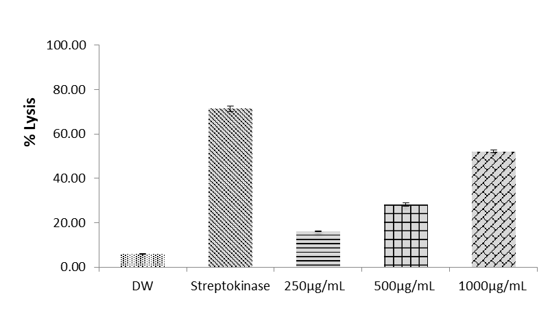 Blood clot (thrombus) developed in the circulatory system due to the failure of homeostasis causes vascular blockage and while recovering leads to serious consequences in atherothrombotic diseases [1-3]. Thromboembolic disorders such as myocardial infarction, cerebrovascular thrombosis, pulmonary embolism, and venous thrombolism are life-threatening for human beings [4]. Thrombolytics are used to dissolve the fibrin of blood clots, which are potentially life-threatening, especially those in the arteries of the heart and lungs. It is also used against the clot formed in shunts during kidney dialysis and multiple pulmonary emboli. Commonly used thrombolytic agents are Alteplase, Anistreplase, Streptokinase, Urokinase, and tissue plasminogen activator (TPA) to dissolve clots [5].