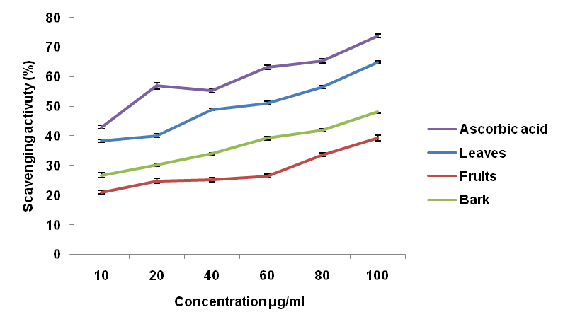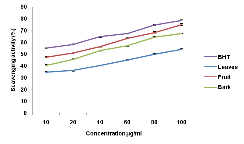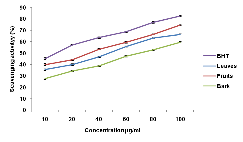 The antioxidant activity of the extracts and the standard antioxidant BHT, expressed as the percentage scavenging activity of the DPPH free radicals is given in fig. 1. The extracts show inhibition ranging from 34.56±0.69 to 75.00±0.89%. Among the extracts the highest scavenging activity 75.00±0.89% is shown by the fruit extract at 100 μg/ml, followed by 68.41±0.59% exhibited by 80 μg/ml of the fruit extract and 67.33±0.24% exhibited by 100 μg/ml of the bark extract. The standard antioxidant BHT exhibit 78.50±0.43% inhibition at 100 μg/ml. DPPH is a free radical which is stable at room temperature, and this method is often employed to determine the antioxidant activity of many plant extracts. DPPH is a stable nitrogen-centered free radical, the color of which changes from violet to yellow upon reduction by either the process of hydrogen-or electron-donation. Substances which are able to perform this reaction can be considered antioxidants and, therefore, radical scavengers [22].