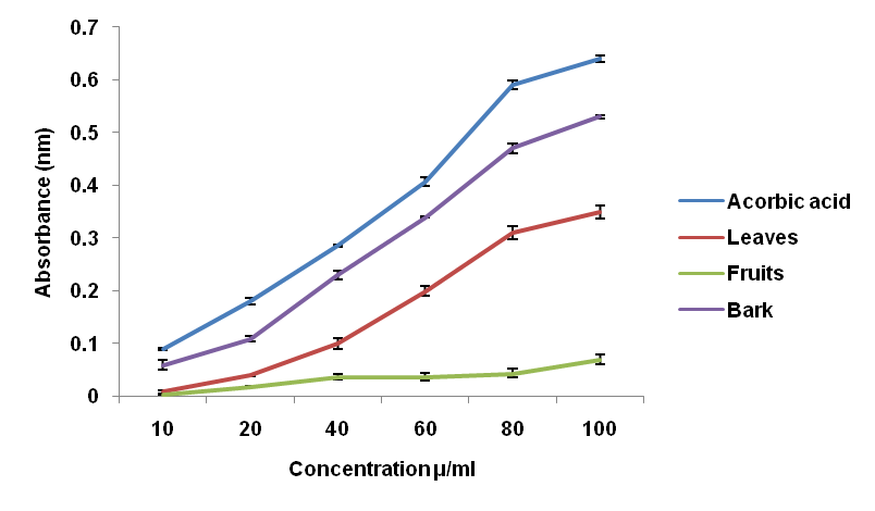 The reducing power assay is often used to evaluate the ability of an antioxidant to donate an electron. The concentration of ferrous ions can be determined by absorbance measurement at 700 nm. Increased absorbance of the reaction mixture indicated increased reducing power of the extracts as shown in fig. 4. In this assay, the reducing power of the extract increased with the increase in their concentration suggesting that some compounds in the extract may be able to donate hydrogen atom to break the free radical chain reaction. The presence of an antioxidant in the extract resulted in reduction of the ferric cyanide complex (Fe3+) to the ferrous cyanide form (Fe2+). Since the absorbance of the reaction mixture increases it indicated increased reducing power of the extracts and thus proved that the extracts possess reducing power even though the reducing power of the extracts were lower than the standard ascorbic acid. The bark extract at 100 µg/ml (0.5 nm) shows the highest reducing power among the three extracts.