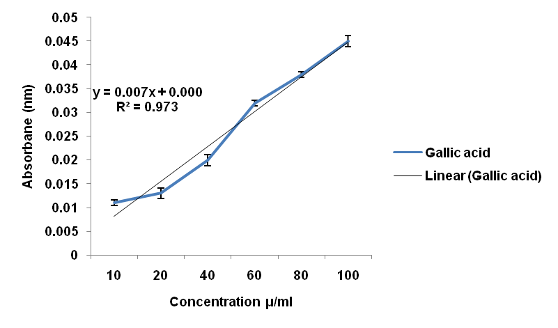 Total phenols are reported as Gallic acid equivalents (GAE) by reference to a standard curve shown in fig. 5. Phenolics or polyphenols are plant secondary metabolites and are very important by virtue of their antioxidant activity by chelating redox active metal ions, inactivating lipid free radical chains and preventing hydroperoxide conversation into reactive oxyradicals [28]. Gallic acid being the most important polyphenol in natural products was used to determine phenolics of tested plant methanolic extracts. The total phenolic content of the leaves, fruits and bark of Rhus javanica L. were found to be 36.16, 47.00 and 49.86 mg GAE/g dry weight of the methanolic extracts respectively.