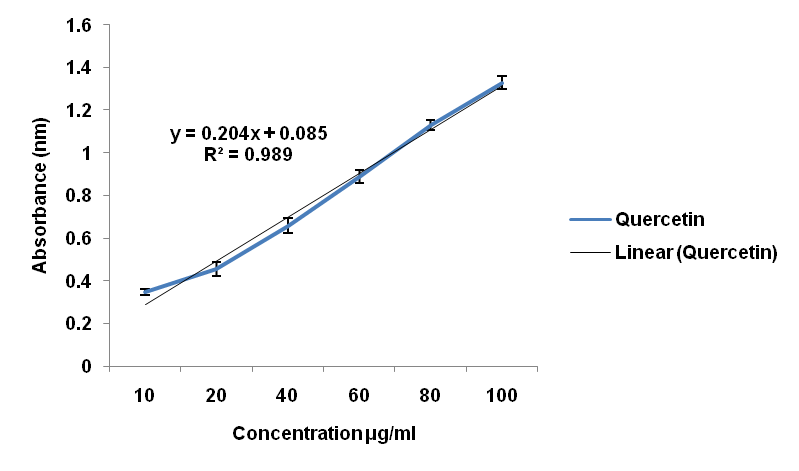 Fig. 6: Standard calibration curve for quantification of flavonoid content. Values are expressed as mean±SEM. Each value is the mean of three (03) essays (n =3)