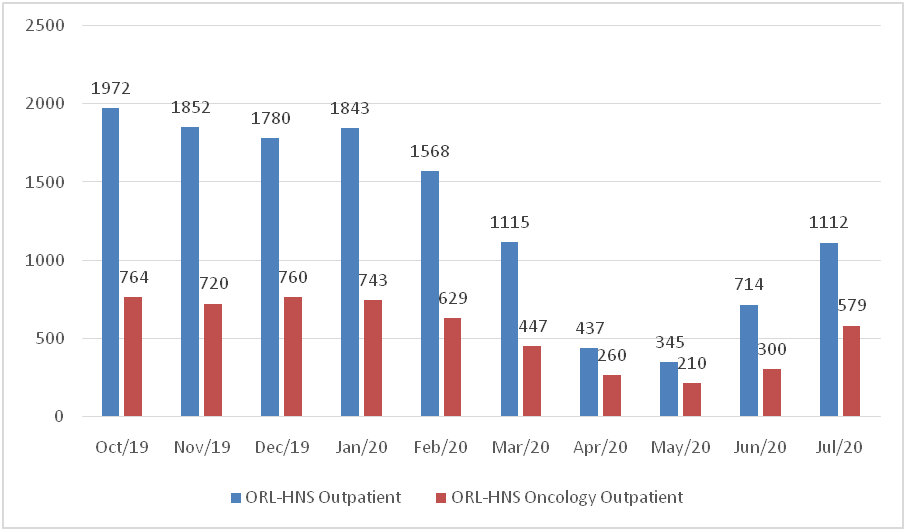 The number of outpatient visits at Otorhinolaryngology-Head and Neck Surgery Departement, Dr. Hasan Sadikin General Hospital Bandung from March to July was 3.723 patients with 1.796 of them are oncology outpatients. There was a significant decrease in the number of ORL-HNS outpatient in April and May and began to increase steadily in June and July. When compared with the number of ORL-HNS outpatient in February, there was a decrease of 72% of outpatients in April and reached 78% in May. Likewise, for ORL-HNS oncology patients, there was a decrease in outpatients by 58% in April and 66% in May compared to February. The number of outpatients started to increase in June with the addition of outpatients by more than 100% in ORL-HNS Outpatient and 43% in ORL-HNS oncology outpatient (fig. 1).