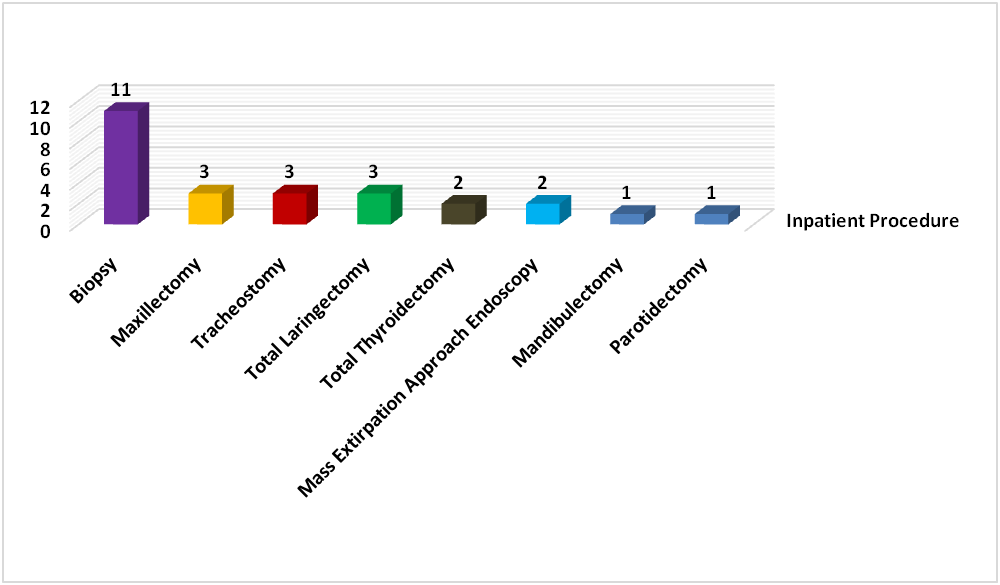 Besides, the most common procedure performed in inpatient rooms is biopsy with a total of 11 procedures, followed by maxillectomy and tracheostomy with 3 procedures each (fig. 3).