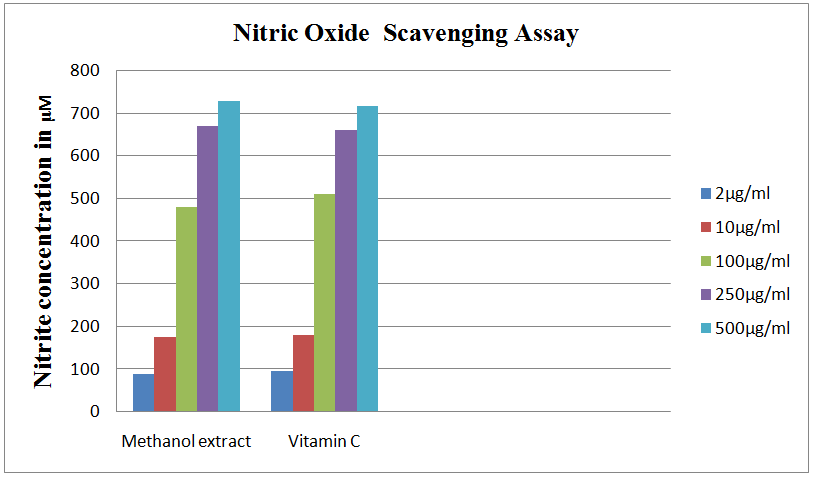 To 1 ml of various concentrations of methanolic extract taken in different test tubes, 0.3 ml of sodium nitroprusside (5 mM) in phosphate buffer was added. The test tubes were incubated at 25 °C for 5 hr after which, 0.5 ml of Griess reagent (1% sulphanilamide, 0.1% naphthyl ethylene diamine dichloride and 3% phosphoric acid) was added. The absorbance of the chromophore was read at 546 nm. The experiment was performed in triplicate [13]. Vitamin C was used as positive control.