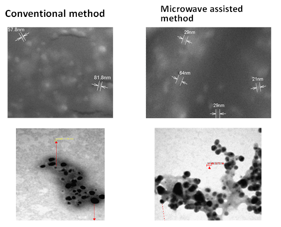 The synthesis, characterization and application of biologically synthesized nanomaterials have become an important branch of nanotechnology. The silver nanoparticles were synthesized from Brassica oleraceae using conventional and microwave assisted methods (BOAgP-1 and BOAgP-2) (Fig.1) We studied the effect of silver nanoparticles of Red cabbabge with different methods such as conventional and microwave assisted methods. In this study the bio-reduction of aqueous Ag+ ions by the leaf extract of the plant Brassica oleraceae by both the method were studied. T.h.e formation of silver nanoparticles by reduction of the aqueous silver ions during exposure of Brassica oleraceae extract was assessed by UV-Vis spectroscopy. The AgNP particles were confirmed by the colour change from pale purple colour to dark brown colour. The surface plasmon band in the silver nanoparticles solution remains close to 400 nm throughout the reaction period suggesting that the particles were dispersed in the aqueous solution with no evidence for aggregation. The peak is shifted from 380 nm to 420 nm* after the nanoparticles of Brassica oleraceae indicating the formation of Nanoparticles (fig 2). T.h.e SEM micrographs ofAgNps (fig 3) obtained in the filtrate showed silver nanoparticle in solution with an average size of about 21 -81 nm for both the types. TEM images recorded from the drop-coated film of the AgNO3 synthesized by treating with silver nitrate solution. The particle size histogram of silver particles produced by red cabbage shows that the particles range in 10-25 nm and possess an average size of 22 nm for both the methods (fig.3.). The TEM was used to evaluate the hydrodynamic size of phytochemical coated silver nanoparticles from red cabbage. The violet red color observed in SEM and TEM determination of stable samples showed a well dispersed nanoparticles with silver by both the methods.