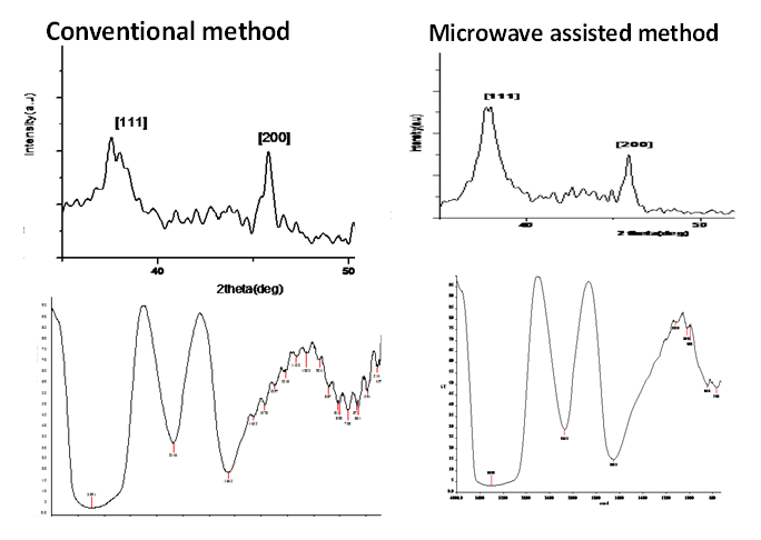 The particle size of synthesised silver nanoparticles was characterised by XRD analysis. Analysis through X-Ray diffraction confirmed the presence of elemental silver signal of silver and it also provided additional information beyond basic identification. XRD patterns of the synthesised silver nanoparticles using the extract of Brassica oleraceae is shown in the fig. 4. The X ray diffraction peaks at 2θ=38 and 46 indexed as 111,200 planes of silver in is observed in conventional method and microwave assisted methods. The particle size of the silver was found to be 24 nm.