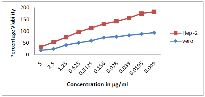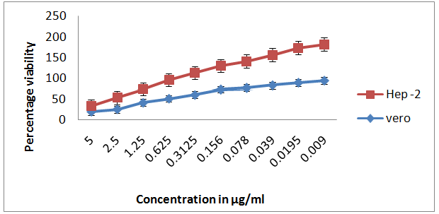 The assay measures the reduction of dye by mitochondrial dehydrogenase and assumes the cell viability is proportional to the production of purple formazan which is measured spectrophotometrically. The percentage viability (IC 50value) of both the particles BOAgP-1 and BOAgP- 2 for HEp -2 and Vero cells were found to be 63 μg and 32 μg and 64 μg and 30 μg.