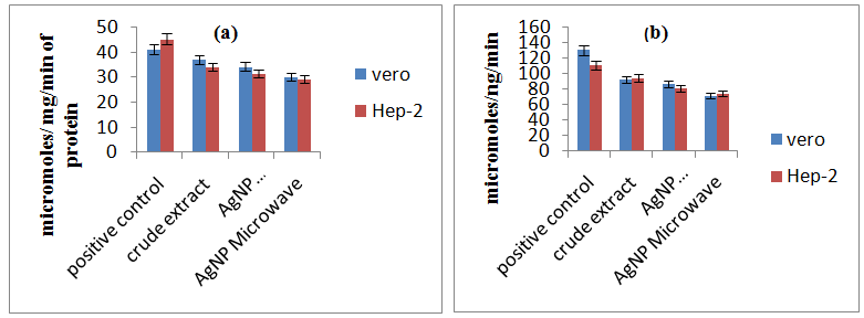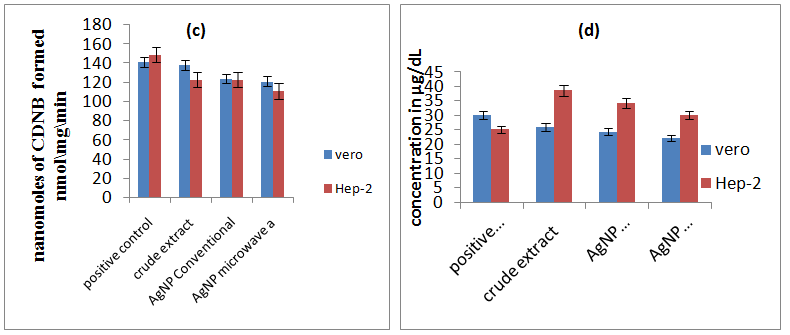 Vero and HEp-2 cells were plated (2x106) and treated with 100 µg of synthesized silver nanoparticles (BOAgP-1 and BOAgP-2) of Brassica oleraceae for 24 hrs. Cells were collected from the culture flasks using cell scrapper. Cells were centrifuged to get cell pellet and the pellet was sonicated in cold phosphate buffer. Sonicated cell suspension was centrifuged at 3000 rpm for 10 min at 4 ˚ C. Supernatant was collected and was used for analysis for various antioxidant enzymes.