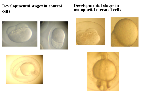 In vivo toxicity studies were carried out in Zebra fish embryos. Different concentrations of synthesized nanoparticles from both methods were given in the egg medium along with the Zebra fish embryos. T.h.e varying concentrations starts from 1000 μg to 5000 μg /100ml* of the egg water and it is feeded to the embryos and observed their developmental stage pattern with the normal control embryos. Large amounts of dark material were found in the gut tract of fish embryo but not in the control (fig 9).