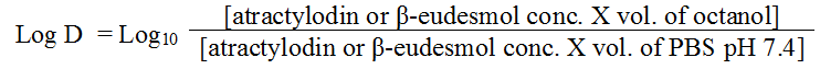The lipophilicity of the test compounds as reflected by the partition coefficient (Log P) and distribution coefficient (Log D) was determined by the shake-flask method [17, 18]. Atractylodin and β-eudesmol were dissolved in DMSO to obtain a stock solution of 200 µg/ml. The stock solution (10 µl) was diluted with the pre-saturated mixture containing 100 µl of n-octanol and 990 µl of aqueous phase (water/PBS pH 7.4), and followed by rotary mixing at 30 rpm for 1 h at 25 °C. The organic phase (upper layer) and the aqueous phase (lower layer) were separated through centrifugation at 10,000×g for 20 min. The concentrations of atractylodin and β-eudesmol in each layer were analyzed by HPLC. Log P and Log D were calculated from the ratio of the logarithm of atractylodin or β-eudesmol concentration in aqueous and octanol phase as follows: