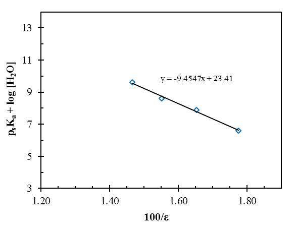 Where log [H2O] is the molar water concentration of the given solvent mixture. This method is the most widely used procedure in cosolvent techniques [24, 25]. The experimental values of the dielectric constants of acetonitrile-water mixtures (30%, 40%, 50%, and 60%) were obtained, and interpolation was used for the calculation of the dielectric constants of other acetonitrile-water mixtures [23].
