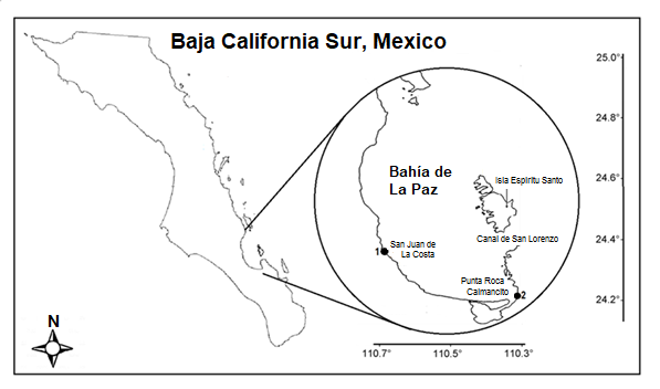 Fig. 1: Algae collection sites in Bahía de La Paz, at the south of Baja California peninsula: 1) San Juan de la Costa and 2) Punta Roca Caimancito