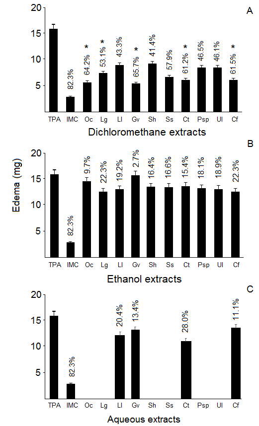 Fig. 2: Topical anti-inflammatory activity of the macroalgae extracts (1 mg/ear). A) Dichloromethane (CH2Cl2), B) ethanol (EtOH), and C) aqueous (H2O) extracts. Data are expressed as the mean±SEM; n = 3 for ear edema. *P<0.05; compared-to the control. The edema inhibition percentage is located above each bar. Abbreviations: TPA, 12-tetradecanoylphorbol 13-acetate; IMC, Indomethacin; Oc, Opuntiella californica; Lg, Laurencia gardnerii; Ll, Laurencia lajolla; Gv, Gracilaria vermiculophylla; Sh, Sargassum horridum; Ss, Sargassum sinicola; Ct, Colpomenia tuberculate; Psp, Padina sp.; Ul, Ulva lactuca; and Cf, Codium fragile