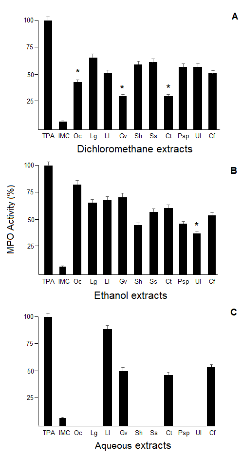 Fig. 3: Comparative effect of the macroalgae extracts and indomethacin on myeloperoxidase (MPO) levels in TPA-inducted ear mouse edema. A) Dichloromethane (CH2Cl2), B) ethanol (EtOH), and C) aqueous (H2O) extracts. Data are expressed as mean±SEM; n =4 *P<0.05 compared to the control. Abbreviations: TPA, 12-tetradecanoylphorbol 13-acetate; IMC, Indomethacin; Oc, Opuntiella californica; Lg, Laurencia gardnerii; Ll, Laurencia lajolla; Gv, Gracilaria vermiculophylla; Sh, Sargassum horridum; Ss, Sargassum sinicola; Ct, Colpomenia tuberculata; Psp, Padina sp.; Ul, Ulva lactuca; and Cf, Codium fragile
