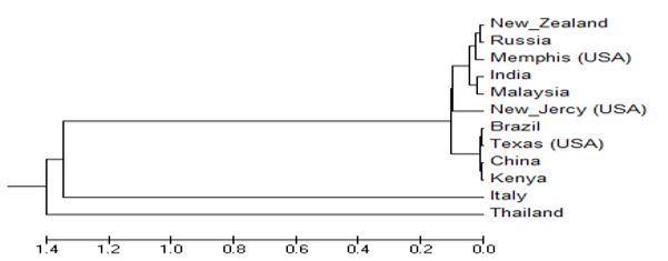 | Amino Acid % | Malaysia | New jersey (USA) | India | Memphis (USA) | New Zealand | Russia | Italy | Thailand | Texas (USA) | Brazil | China | Kenya |