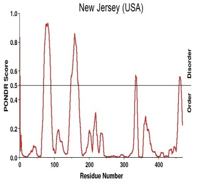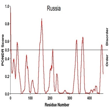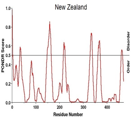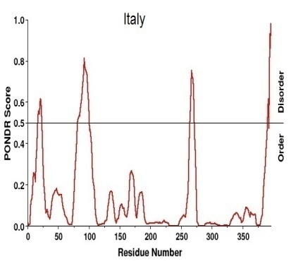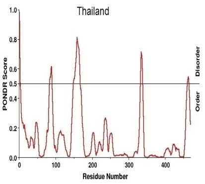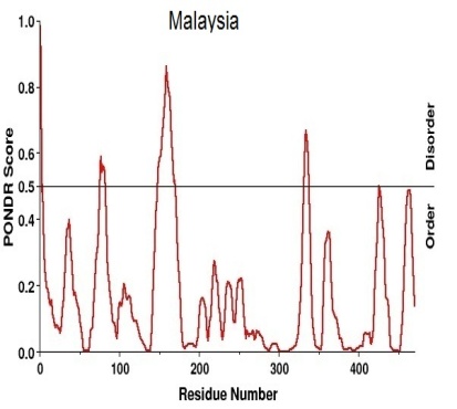 Antigenic variants (table-4) and disorder prediction (table-5) also depicts that there is a similarity between NA H1N1 sequences from Malaysia, India, New Zealand and Russia with the exception of USA. Same way we can say that there is a common similarity among Thailand, Brazil, China and Russia. So from both the tables we can state that Italy NA H1N1 is the unique one among the sequence taken for the study.