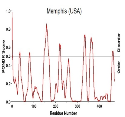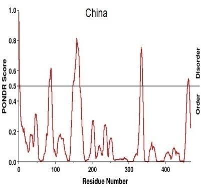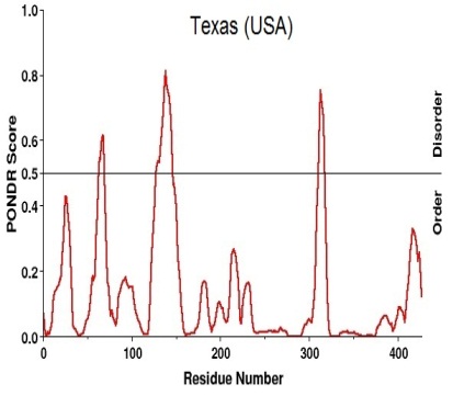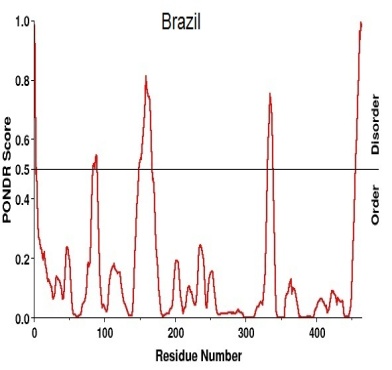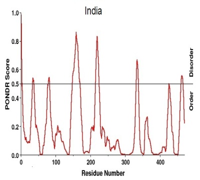 The disorder region of the protein predicted using PONDR®s VLXT software gives the graphical as well as text view of disorder region (table-5). The threshold value is set to 0.5, for the prediction of disorder region of the sequence. A peak over the threshold value shows the disorder region and those present below the threshold value considered as normal region.