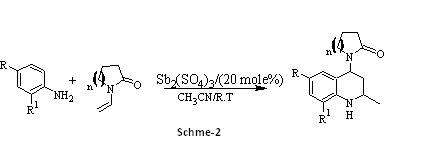 (3) and (4): A mixture of aromatic amine (1m. mol) and N-vinyl pyrrolidine and N-vinyl caprolactum and Antimony (III) sulfate (0.28 m. mol) in 10 cm3 acetonitrile was stirred at room temperature. After completion of reaction (as indicated by TLC), the reaction mixture was quenched in water, extracted with ethylether, dried, concentrated, and separated by column chromatography (Scheme-2).