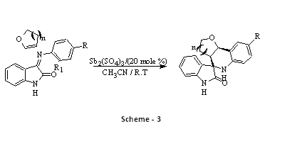 (5) and (6):Isatin amine was made to react with 2.3 dihydrofuran/3,4 dihydro 2H-pyran in presence of Antimony (III) sulfate (20 mol%) in acetonitrile, mixed for 2 hours at room temperature to give corresponding Spirooxy indolyl tetrahydro quinolines (Scheme-3).