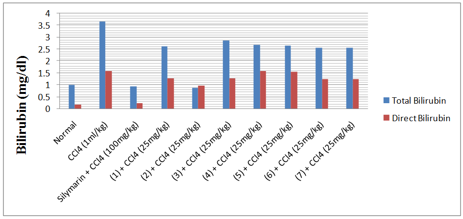 In the experiment wister rats weighing 150-200 g were used. The rats were divided into ten groups of six animals in each group. Group I: Served as normal control and received 1% Tween 80 in distilled water. Group II: Served as negative control and received CCl4 in liquid paraffin (1:1), 1 ml/kg, i. p. Intraperitoneally on 3rd, 6th and 10th day. Group III: Treated with Standard drug Silymarin at the dose of 100 mg/kg p. o for ten days. The Group IV, V, VI, VII, VIII, IX and X received suspensions of synthetic derivatives (1-7) in polyethylene glycol-400 at the dose of 25 mg/kg p. o. for 10 days [11]. Groups III – X were intoxicated with CCl4 1h before the administration of Silymarin or synthetic compounds for ten days.