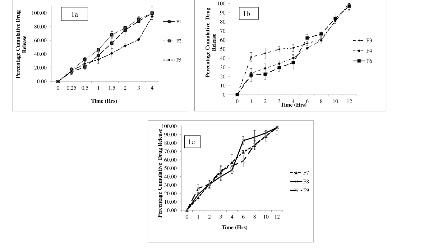 Fig. 1: The in vitro drug release profile of Glipizide loaded mucoadhesive sustained release floating tablets; 1a: Formulations from F1-F2, and F5; 1b. Formulations from F3-F4 and F6; 1c. F7-F9, The data is expressed as mean±SD, n=3