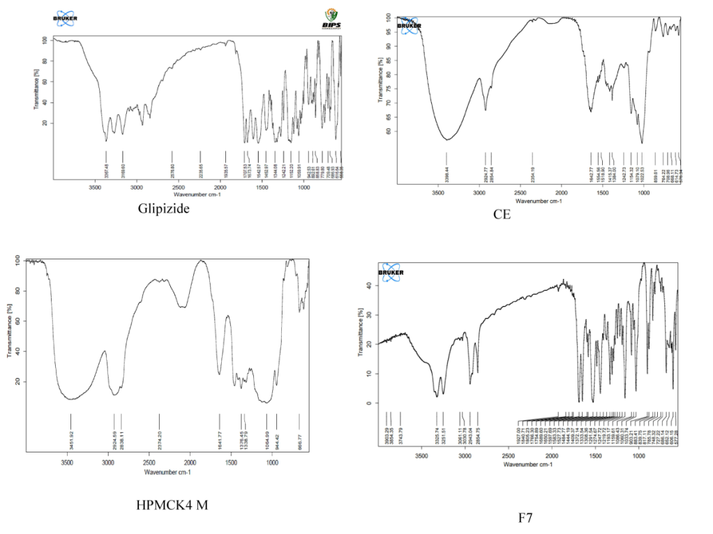 Fig. 2: FTIR spectrum of glipizide, CE, HPMC, and F7
