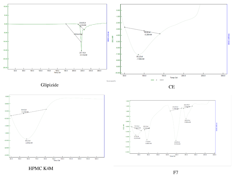Fig. 3: DSC thermograms of Glipizide, CE, HPMC, and F7